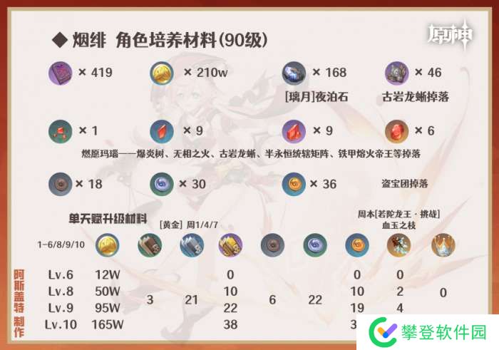 ③ 烟绯的主要输出以靠重击输出,推荐优先升级普通攻击/重击的等级,其次升级元素战技、元素爆发。