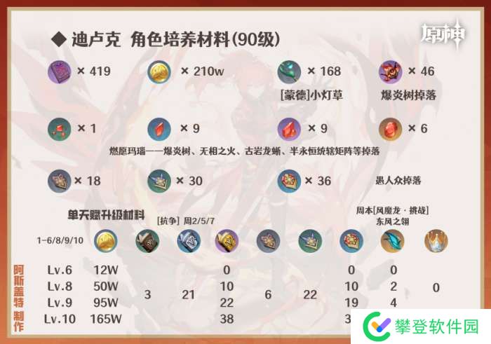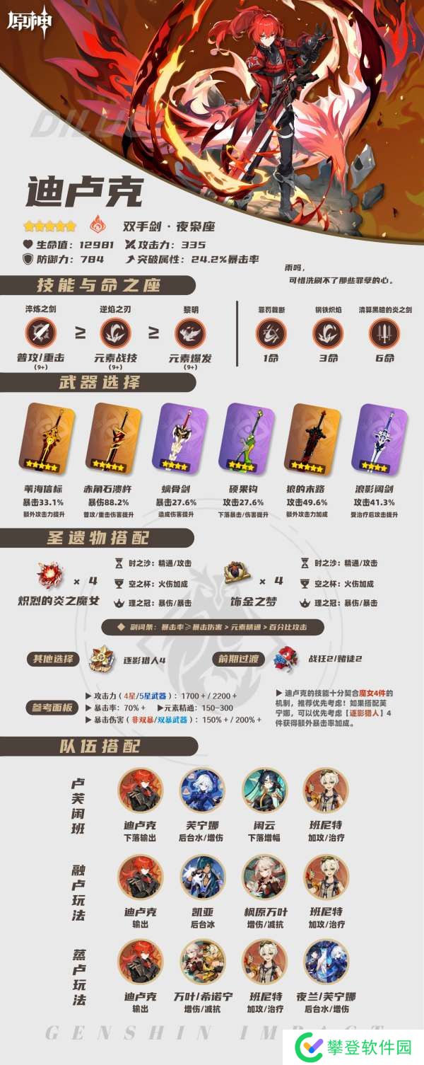 ② 迪卢克需要3个技能全部升级,圣遗物套装优先魔女4件。