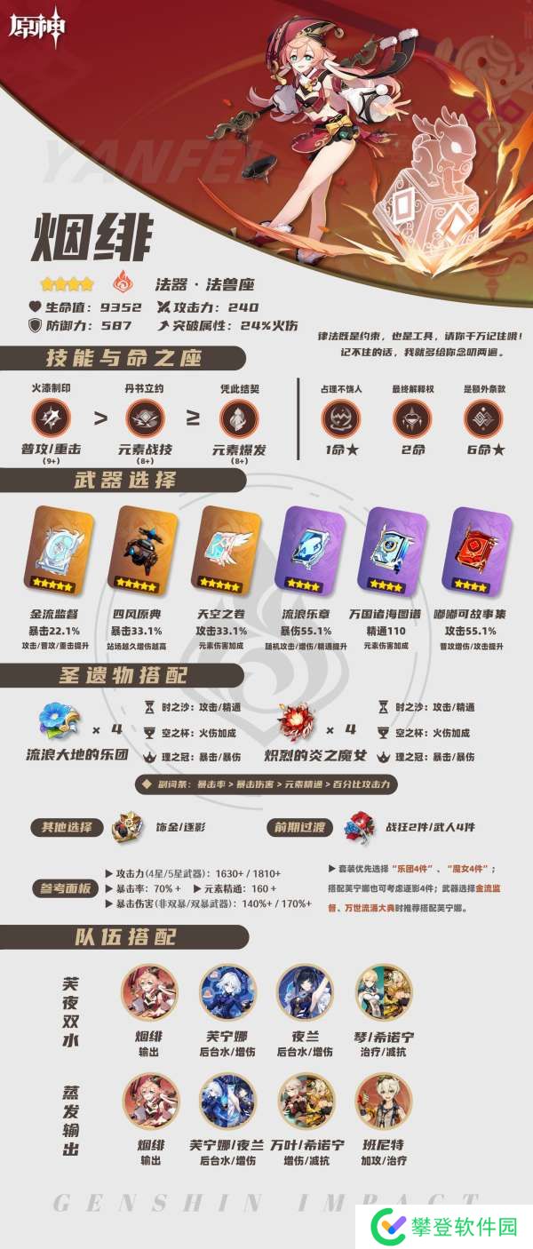② 当前烟绯多为蒸发玩法,配合行秋、夜兰、芙宁娜等角色组成双水;当然还有搭配搭配莫纳、砂糖的爆发玩法;单水玩法也有“烟绯+行秋/夜兰+万叶/砂糖+班尼特”的搭配。