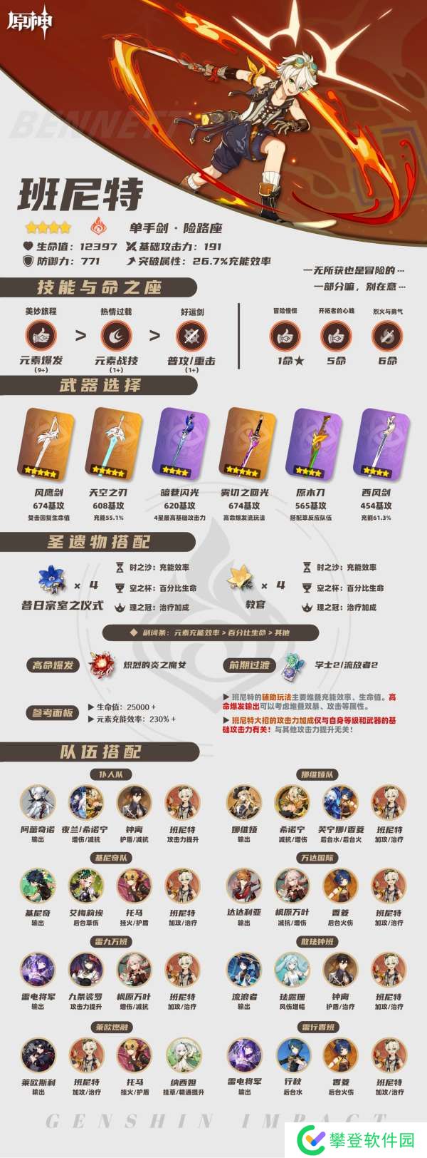 ⑦ 班尼特的配队极为多元化,可根据上图中的示例队伍搭配。