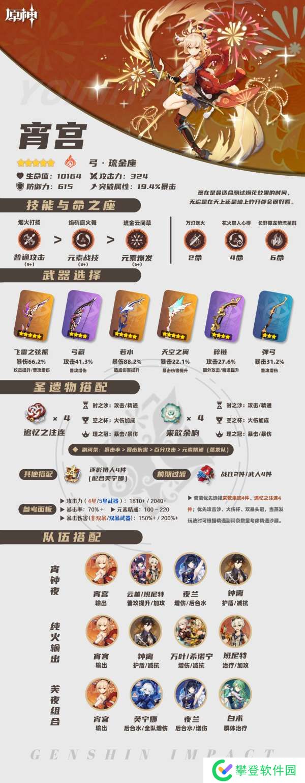 ⑥ 当前宵宫可优选蒸发配队(即宵钟夜组合),6命可选择纯火输出,另外可体验芙夜双水的拓展玩法。(烟花武装目前版本强度表现力一般,不再推荐优先考虑)