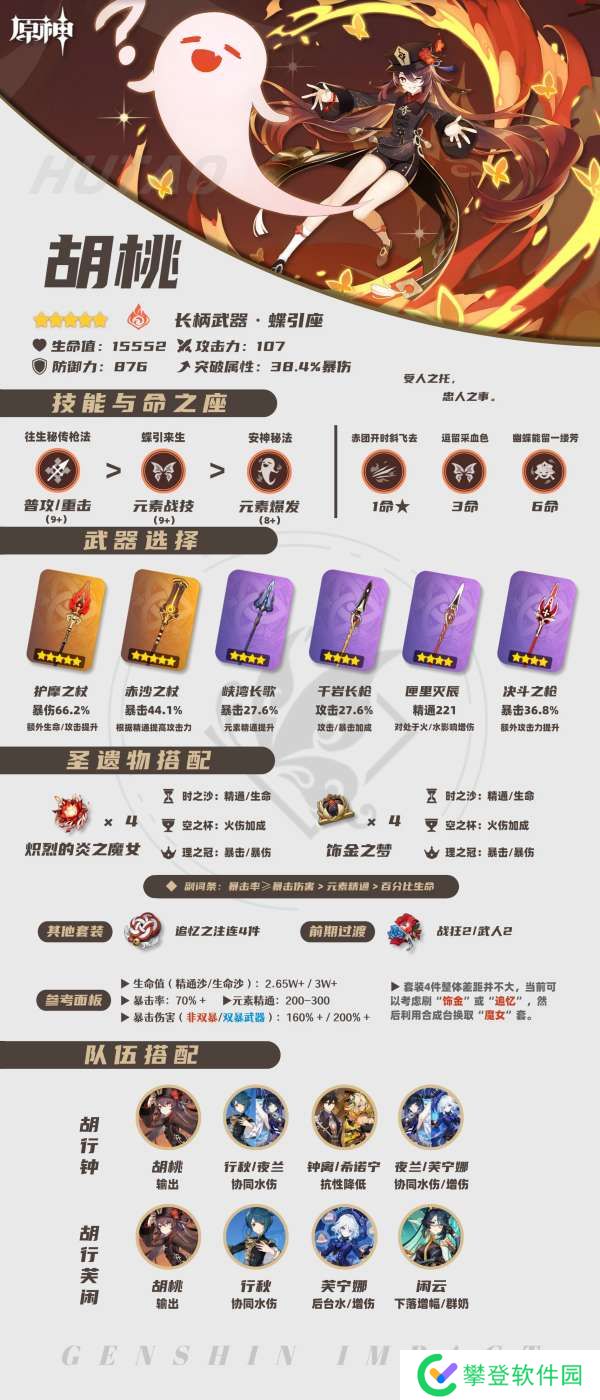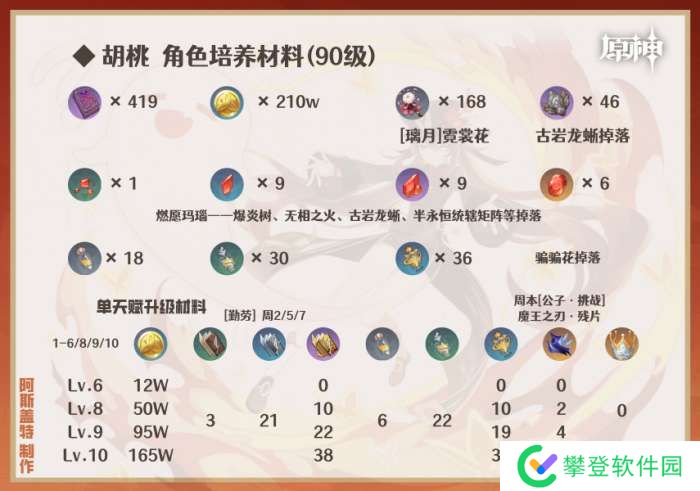 ① 胡桃在升级技能时优先升级普通攻击/重击的等级(9+),其次再升级元素战技(8+)、元素爆发(8+)的等级。