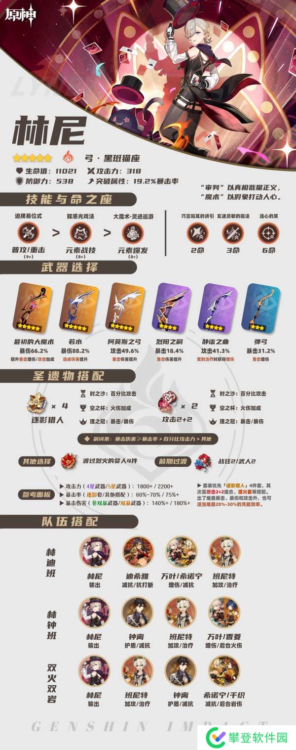 ② 林尼如果选择【逐影猎人】4件,通常是不推荐优先考虑暴击武器的,因为逐影4件本身就可以提供36%的暴击率,再携带暴击武器会很容易出现暴击溢出的情况!