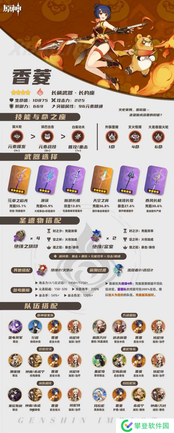 ① 香菱在“雷神国家队”的充能可在200%左右;在“融化流甘雨”、“万达国际”等队伍时推荐堆叠至240%及以上。
