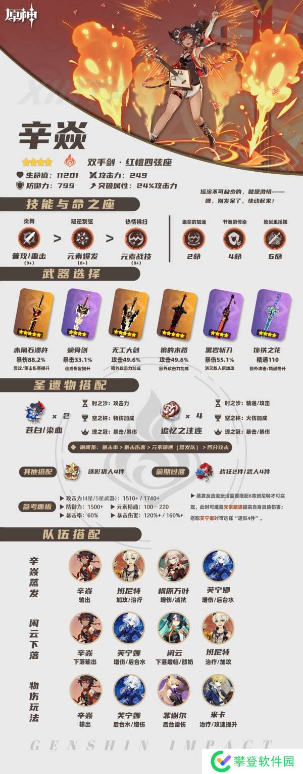 ⑤ 当前的辛焱高输出队伍更多是搭配芙宁娜、班尼特6命的蒸发队伍;物理队也能搭配芙宁娜,组成“辛焱+芙宁娜+米卡+菲谢尔”的组合。