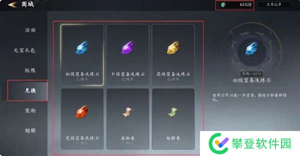 目前的兑换界面商品有初级到究极(蓝/紫/黄/红)洗练石和"宠物/翅膀"抽奖卷。