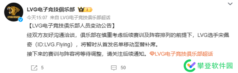 经双方友好沟通洽谈,俱乐部在慎重考虑后续赛训及阵容排列的前提下,LVG选手宋佩奇(ID:LVG.Flying),将暂时从首发名单移动至替补席。