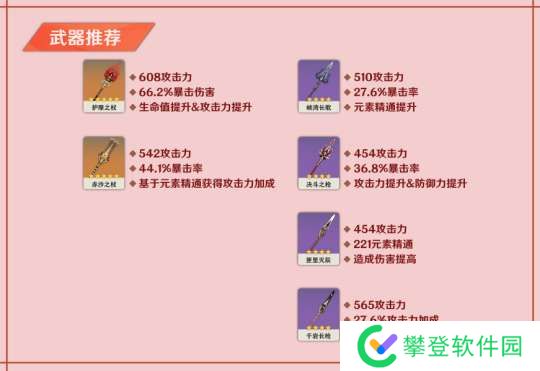 在武器方面,有不少选择——除了专属武器护摩之杖外,赤沙之杖也是一个不错的选择,因为它拥有44.1暴击率加成,可以给胡桃带来出色的表现。如果没有携带专属武器,或者需要在搭配班尼特时降低攻击力,这把武器就更有用了。总的来说,这两把武器都可以成为胡桃的首选。