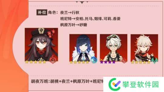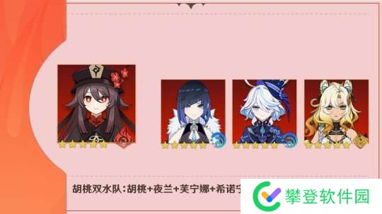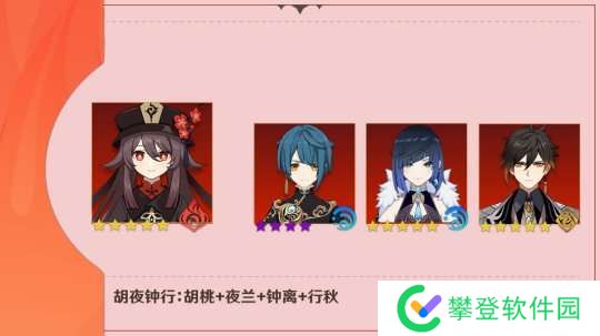 首先是最经典的胡行钟夜队伍——它的生命值依赖使得这支队伍的生存能力非常强,同时夜行两名产球大户双水互充和胡桃的e启动也保证了它的超强再启动能力,在实战中几乎不需要担心能量问题。但是,它的群体能力比较弱,更多地依赖夜兰e技能和一命胡桃的重击来追击敌人。