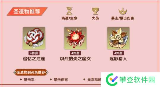 圣遗物中,优选追忆4件套或者魔女4件套都有其各自的优劣之处。作者的经验是,当角色命中较低时,选择追忆4件套能够获得更高的刷取性价比并更适合胡桃那种能够持续攻击的环境。而选择魔女4件套则适用于需要自由释放大招并能快速斩杀的少量群环境下。