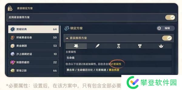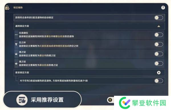 推荐的「通用锁定方案」和「套装锁定方案」均已按照常见用途设置好自动锁定的属性。并且随着游戏的更新,开发组还会对推荐套装方案进行调整,无需旅行者重复操作。如果想要方便省事,可以直接一键开启;如有更细致的个性化需求,可以给各套装或部件设置单独的方案。