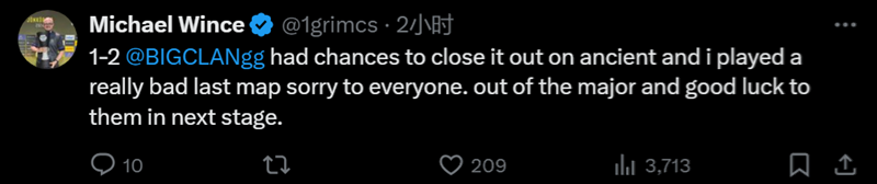 Grim:1-2 BIG。本有机会在Ancient上结束比赛的,但我在最后一张图上打得非常糟糕。对不起大家。从Major出局了,祝那些晋级下一阶段的队伍们好运。