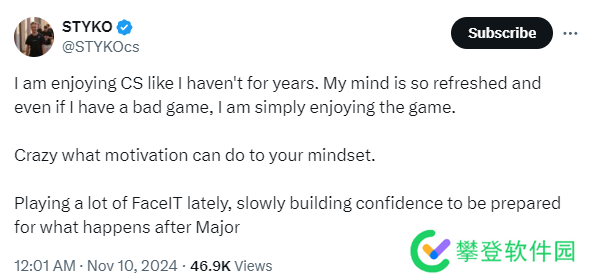 “现在的我享受CS给我带来的乐趣,这是多年来从未有过的感觉。我的精神面貌焕然一新,即使打得不好,我也能享受游戏的乐趣。