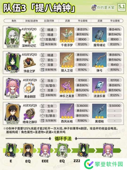 ◆ 注意事项:钟离 带可以带 绝缘 提高伤害,当然 2生命+2生命 会让人安心,但依旧推荐 钟离 带 西风长枪,让3位C带更多与输出有关的词条;低命神子 可以带 精通沙 ,但 满命神子 一定要带 攻击沙。