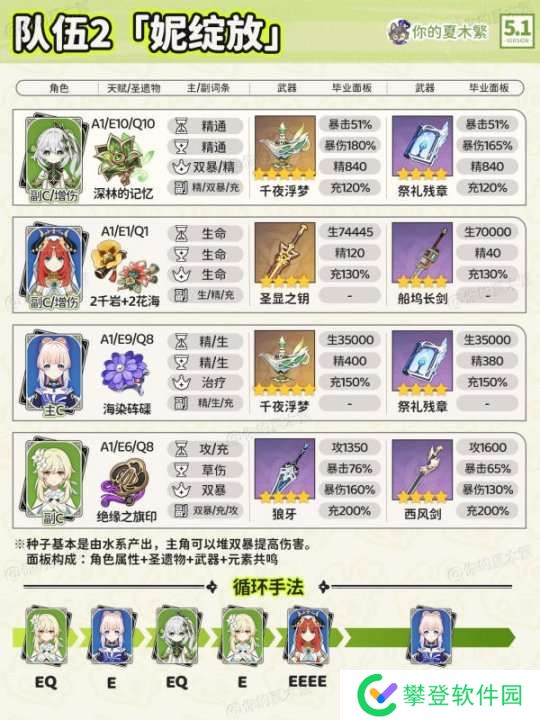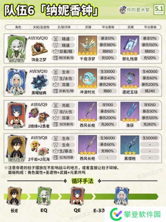 ◆ 替换角色:万叶 和 希诺宁 可替换钟离(前者伤害更高,后者可以安心输出),调香师 可替换 纳西妲。