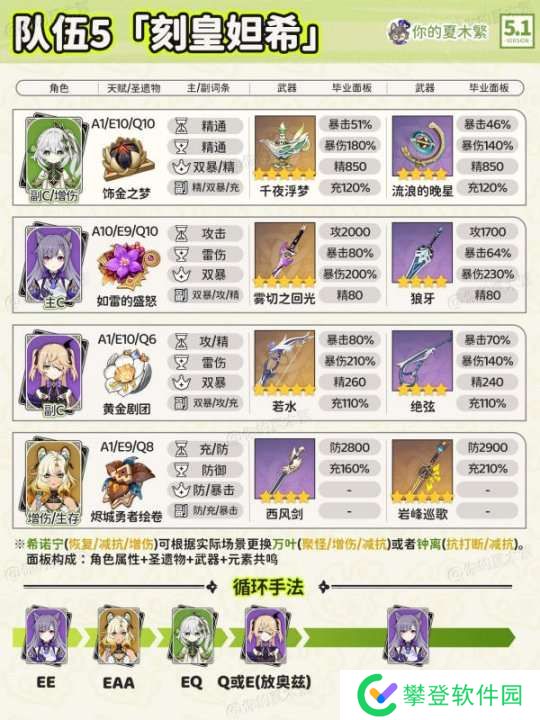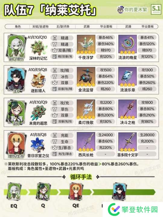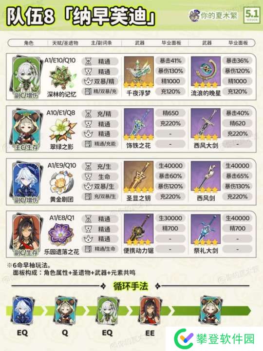 包含 8个 配队所有角色的武器、圣遗物、毕业面板和队伍循环手法
