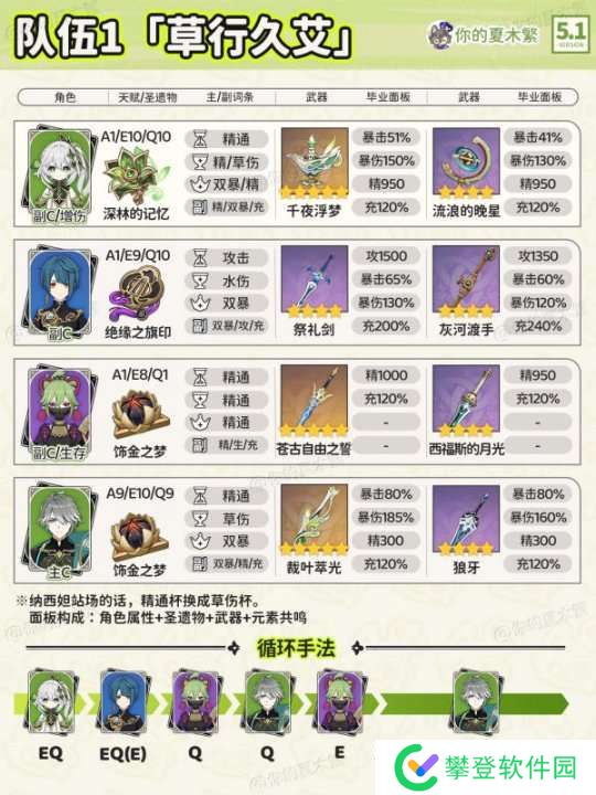 ◆ 注意事项:由于单草入队,纳西妲带 饰金套 比带 草套 的收益更好,精通词条也更容易毕业。(种子队,即使是单草,也需要队伍有角色带 草套 ,可视作种子也是一个可以提供草伤的角色)