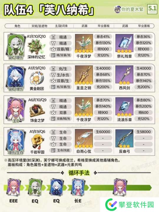 ◆ 注意事项:早柚 一定要染上火,所以 迪希雅 释放EE技能后,快速切到 早柚 长E,开转;队伍不刚需 芙宁娜 的Q技能,充能可以低一些,多一些输出词条。