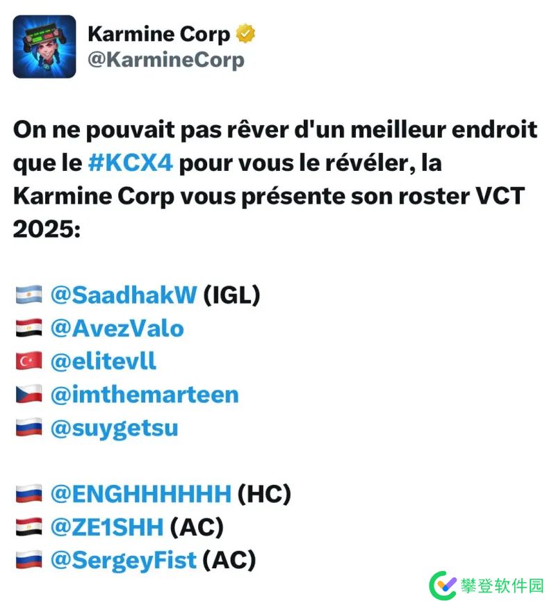 Karmine Corp正式公布了他们2025 VCT赛季的参赛阵容,队伍将由Saadhak担任指挥,avez、Elite、Mar****和suygetsu作为成员共同出战。教练团队方面,ENGHHHHHH将担任主教练,ZE1SHH和SergeyFist担任助理教练。