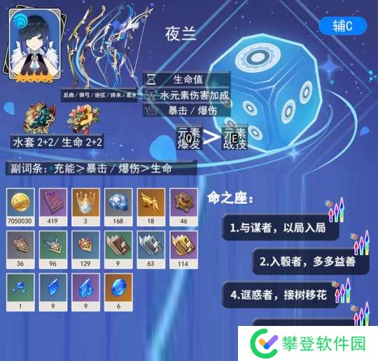 夜兰是个后台大招输出的角色,跟行秋、托马、北斗那些一样通过普攻触发大招的,伤害很强!并且只吃生命值,【完全不吃攻击力】的设定。所以三星武器只要特效和副词条好的话也可以用,可以说夜兰的造价是非常低的,很适合萌新玩。