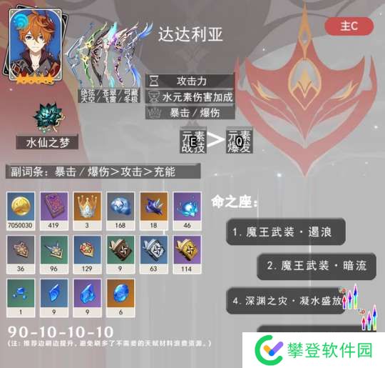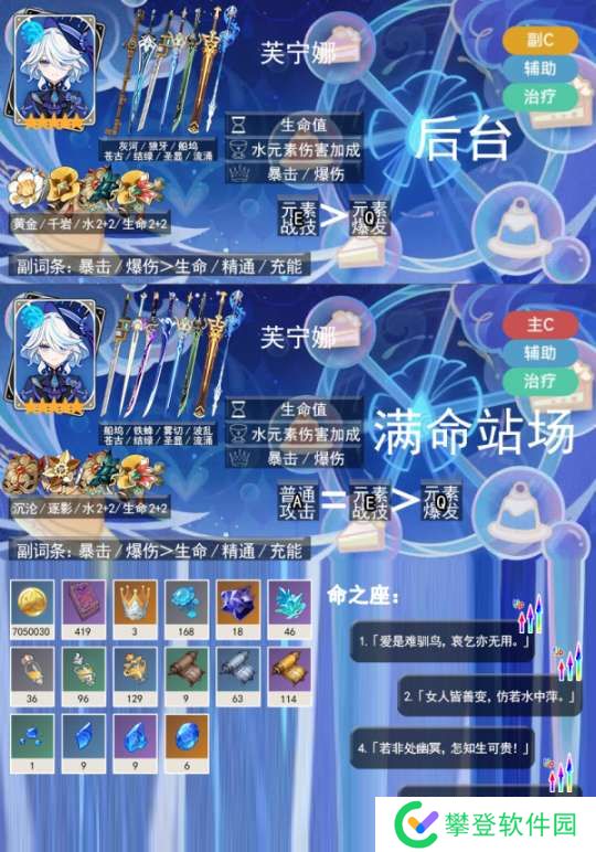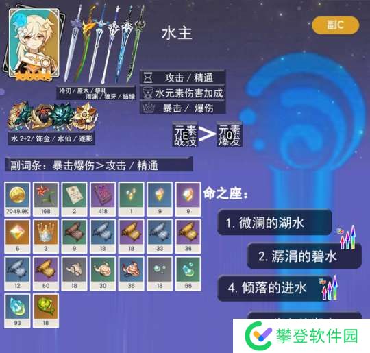 水神的挂水能力一般,但是最主要的作用还是满命前打自己的战技水伤和大招增伤辅助作用,可以辅助自己的站场主C。满命后,还能自己站场打蒸发并增伤。