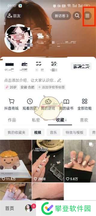 2、然后在我的页面中可以查看作品、收藏、喜欢等信息,我们点击右上角的【三横图标】;