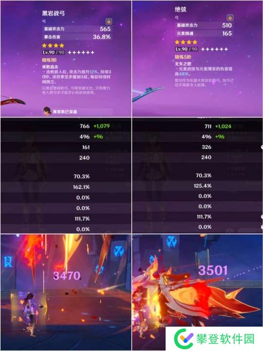 我们对比黑岩战弓和绝弦(武器特效都不起作用),发现在伤害几乎一致(3470和3501)。