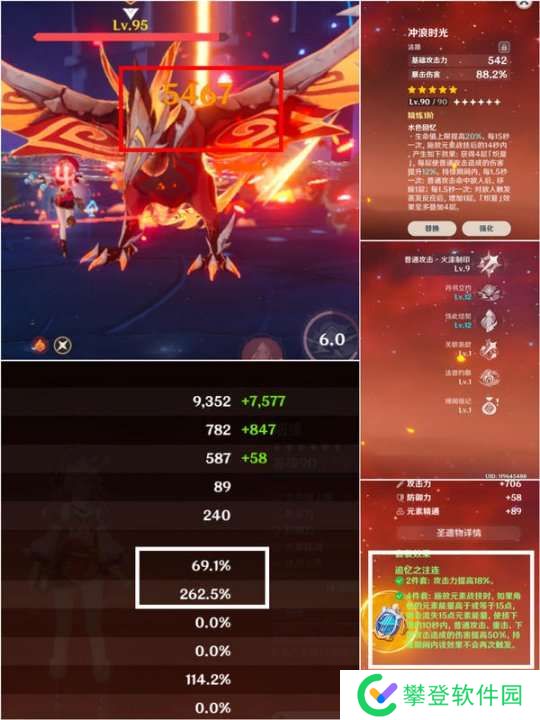 其中武器选择双爆最佳,圣遗物追忆套兼顾下落攻击增伤为最优(追忆套增伤持续10秒,烟绯E技能CD9秒,理论上可以全程吃满50%增伤)。双爆70%260%,以12-1圣骸兽为测试对象,四印重击伤害5467(烟绯主要输出手段)。