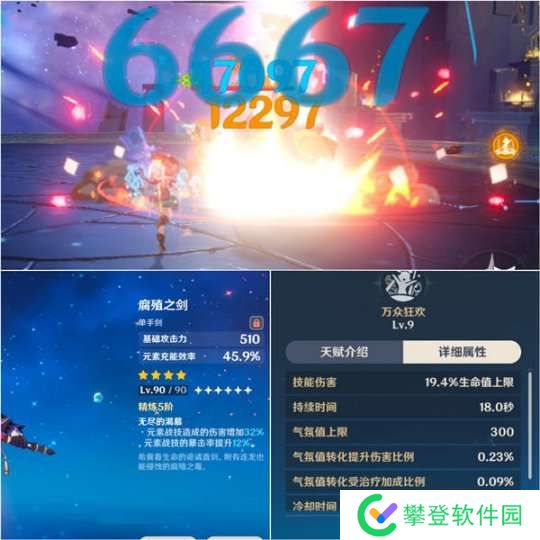 芙宁娜主要是增伤75%(测试中未吃满)和挂水(火C打蒸发伤害增加50%),烟绯实战重击12297,实际增伤能力124.93%。
