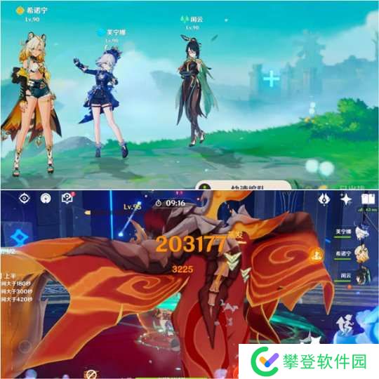 我们分别测试闲云、希诺宁和芙宁娜队对烟绯的实际增伤能力。
