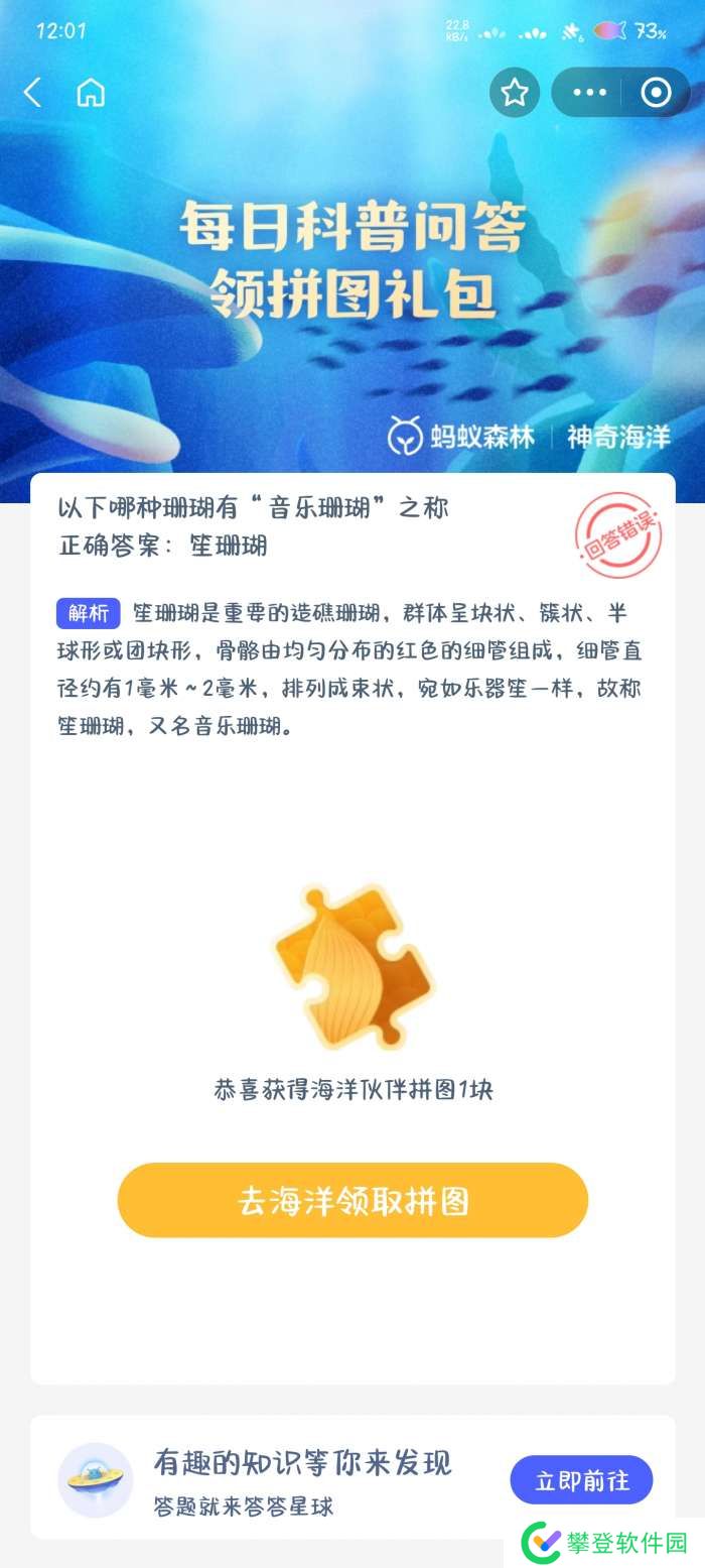 支付宝神奇海洋11.1答案:题目:以下哪种珊瑚有“音乐珊瑚”之称?