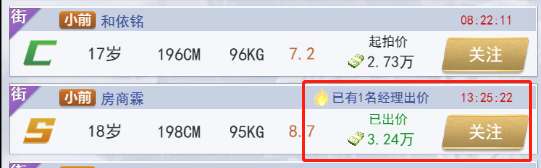 找到心仪的球员,可以尝试出价,街头自由市场采用单次暗拍报价方式,也就是说每个用户只有一次机会,对自己心仪的球员给出一个自己能接受的最高报价。当拍卖结束后,暗拍价格最高者获得,球员将被护送到您的等候室待命,记得第一时间查看。