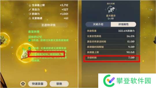 所以这里我们完全可以选择希诺宁用本套圣遗物,她的E技能CD只有7秒,而减抗持续时间长达8秒!理论上只要你按的够快减抗就能全程触发。