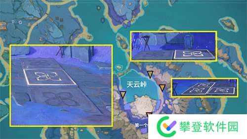 1、在环天云屿的三个位置(下图中金色标点位)可以找到残缺的提示石板。
