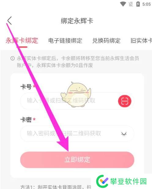 3、输入或扫描卡号与卡密,点击【立即绑定】即可。