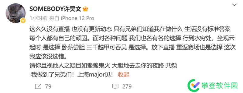 somebody:这么久没有直播 也没有更新动态 只有兄弟们知道我在做什么 生活没有标准答案 每个人都有自己的顽固。面对各种问题 我们也各有各的选择 行到水穷处,坐观云起时 是选择 卧薪尝胆 三千越甲可吞吴 是选择。放下直播 重返赛场也是选择 这次我应该没选错。