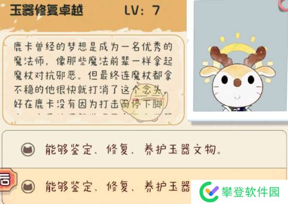 5、鹿族每升一级会提高鉴定能力(黑市购买鉴定需要),修复时长(维护工具时长减少)和养护相对应种类文物。