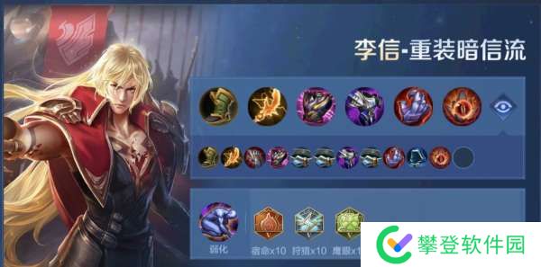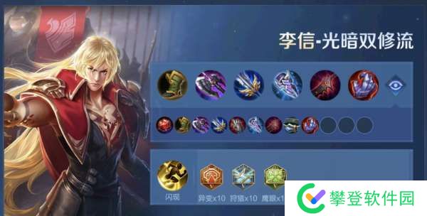 新版李信走双修流,出装上要有物理攻击和物理穿透保证光信的伤害,还要有攻速和坦度来保障暗信的强度。