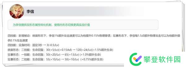 光信形态:每1%额外攻速提升0.15%物理穿透,暗信形态:每1.5点额外物理攻击提升0.1%攻速。