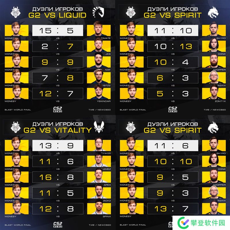 Spirit交锋两次。在这两次BO3的赛事中,m0NESY牢牢压制住了sh1ro,仅仅在对枪数据上输给了donk一次。此外,在和
