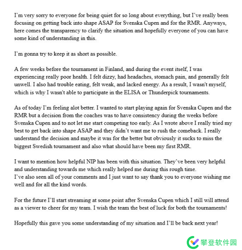 “很抱歉我这么长时间以来都保持沉默,但我真的一直在专注于尽快恢复状态,为瑞典杯和RMR努力。无论如何。现在我尽可能简短的澄清情况,希望每个人都能对此理解。