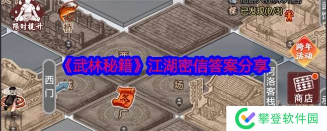 武林秘籍是一款非常有趣的文字武侠冒险RPG游戏,本游戏采用中国经典水墨画技法,为玩家带来多种不同画风的人物绘画可供选择,玩家可以在游戏开始时根据自己的喜好定制武侠的外貌和性别。接下来给大家带来了《武林秘籍》江湖密信答案分享!