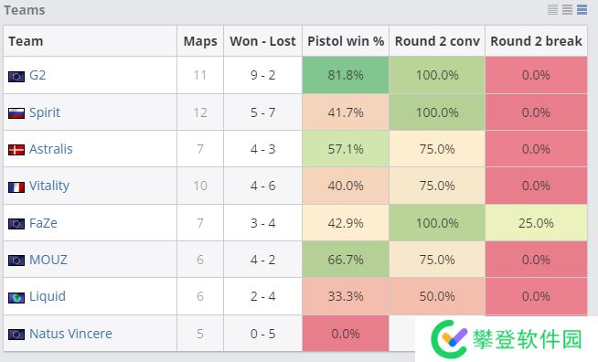 经统计,G2在本次比赛中的手枪局比赛中发挥神勇,他们在一共22个手枪局的比赛中拿下了其中的18个,胜率高达81.8%,为所有参赛队伍之最。