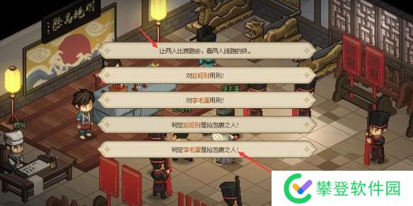3、比试完后选择【判定李毛蛋是抢包裹之人】-【五大板】-【威吓】即可断案成功;