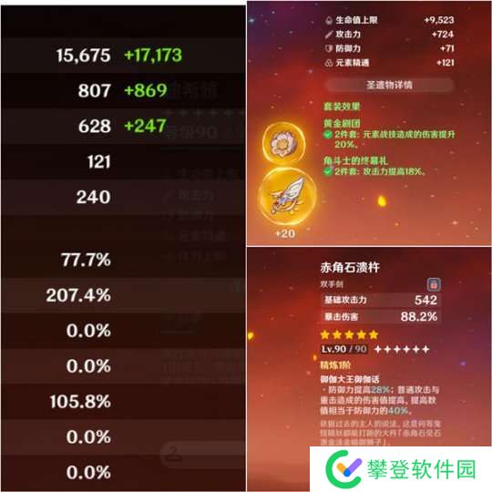 双爆在用88爆伤武器后有77/207,攻击力1676。