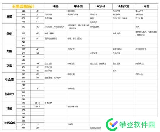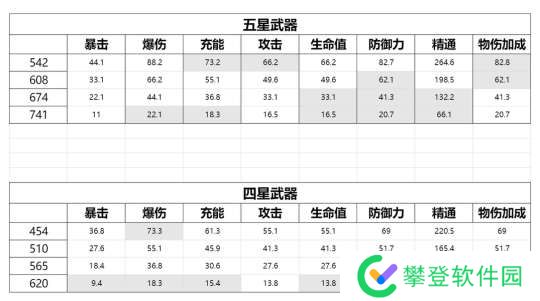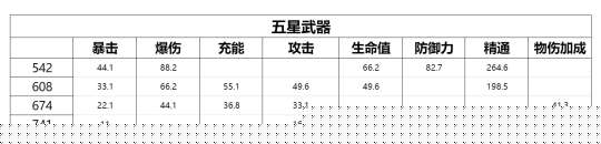 具体到每种武器类型,可以见得,五星武器大多都是双爆副词条,而其他副词条武器一般不那么“受欢迎”。换言之,非双爆武器更容易被平替。