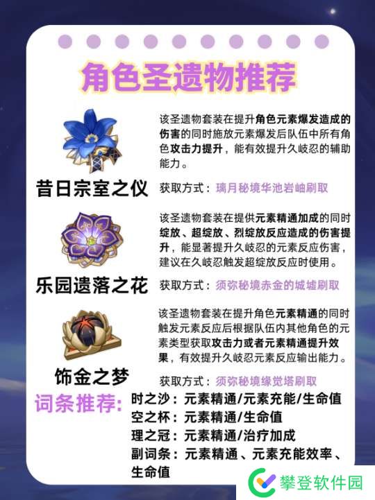 补充说明:久岐忍可以选择的圣遗物套装种类丰富,推荐选择的圣遗物套装包括昔日宗室之仪四件套、饰金之梦四件套和乐园遗落之花四件套(反应队优先使用饰金套或者乐园套,除了上述图中推荐的三种圣遗物套装之外,还可以选择千岩牢固四件套、被怜爱的少女四件套或者海染砗磲四件套),前期可以使用战狂四件套或者教官四件套过渡。