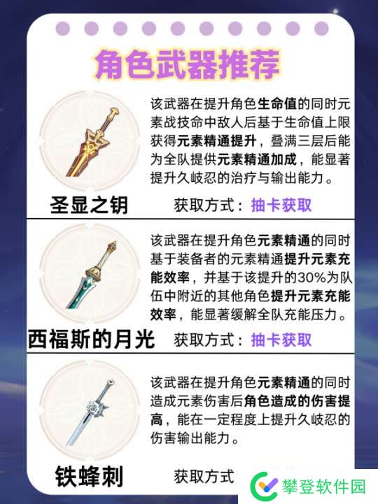 补充说明:久岐忍推荐使用能提升元素精通的武器,除了图上推荐的三把武器之外,五星武器方面还可以选择苍古自由之誓等武器,四星武器方面还可以选择西风剑等武器~