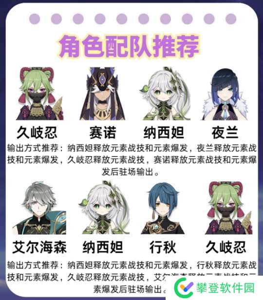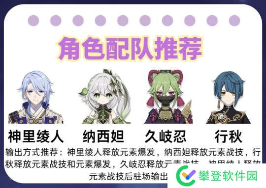 久岐忍作为一位雷元素辅助角色,配队中一般是作为反应的触发者,下面带来三个典型玩法的配队展示: