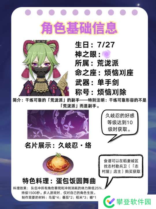 各位旅行者大家好,原神5.1版本下半卡池已经开启,四星雷元素角色久岐忍迎来复刻,相信不少旅行者准备抽取这位角色,本篇攻略将从基础信息、武器推荐、圣遗物推荐、加点分析、命之座解析和配队推荐这六个维度带来详细的介绍~